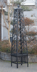 木製オベリスク、ピラミッドシリーズの中で最も大きなオベリスクです。上部まで太いデザインですので、バラの誘引もしやすくなっています。デザインは人気の「ツリー」モデルです。 本体はプラスドライバー1本で簡単に組み立てできます。 最上部フィニアルは3種類からお好きなデザインをお選びください。 カラーも5種類からお選びいただけます。(写真のカラーは「ブラック」です。) また、デザインは「ツリー」意外に「シンプルロッド1」、「シンプルロッド2」、「シンプルロッド3」他のデザインにも対応致します。「お問い合わせ」より、ご要望のデザインを記載の上ご連絡ください。お見積もりを返信いたします。